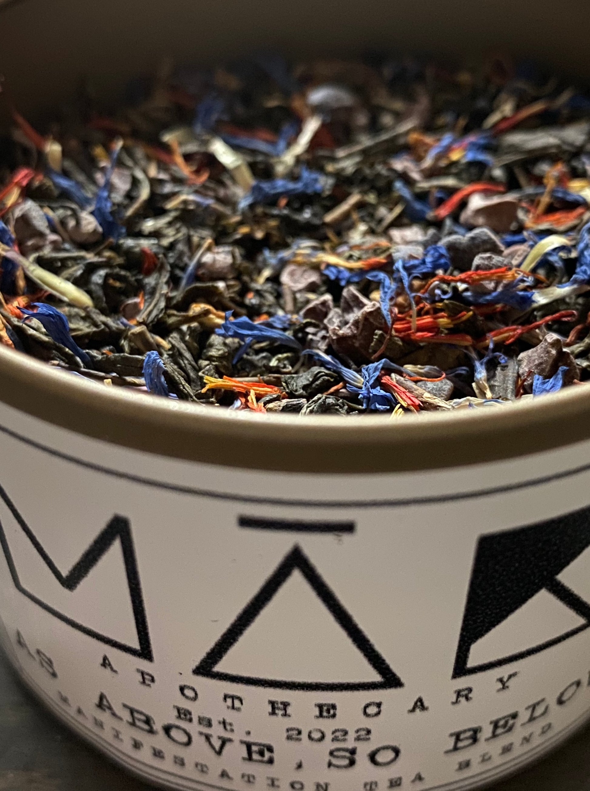 INGREDIENTS: jasmine green tea, joy, blue cornflowers, love, safflowers, cacao citrus peel, divinity, peace of mind, a restored mind, body & soul