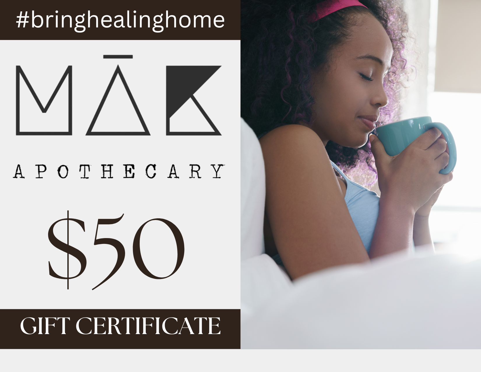Send them a gift certificate from MĀK Apothecary. Choose a $50, $75, $125, or $250 gift card today! All cards are delivered virtually.