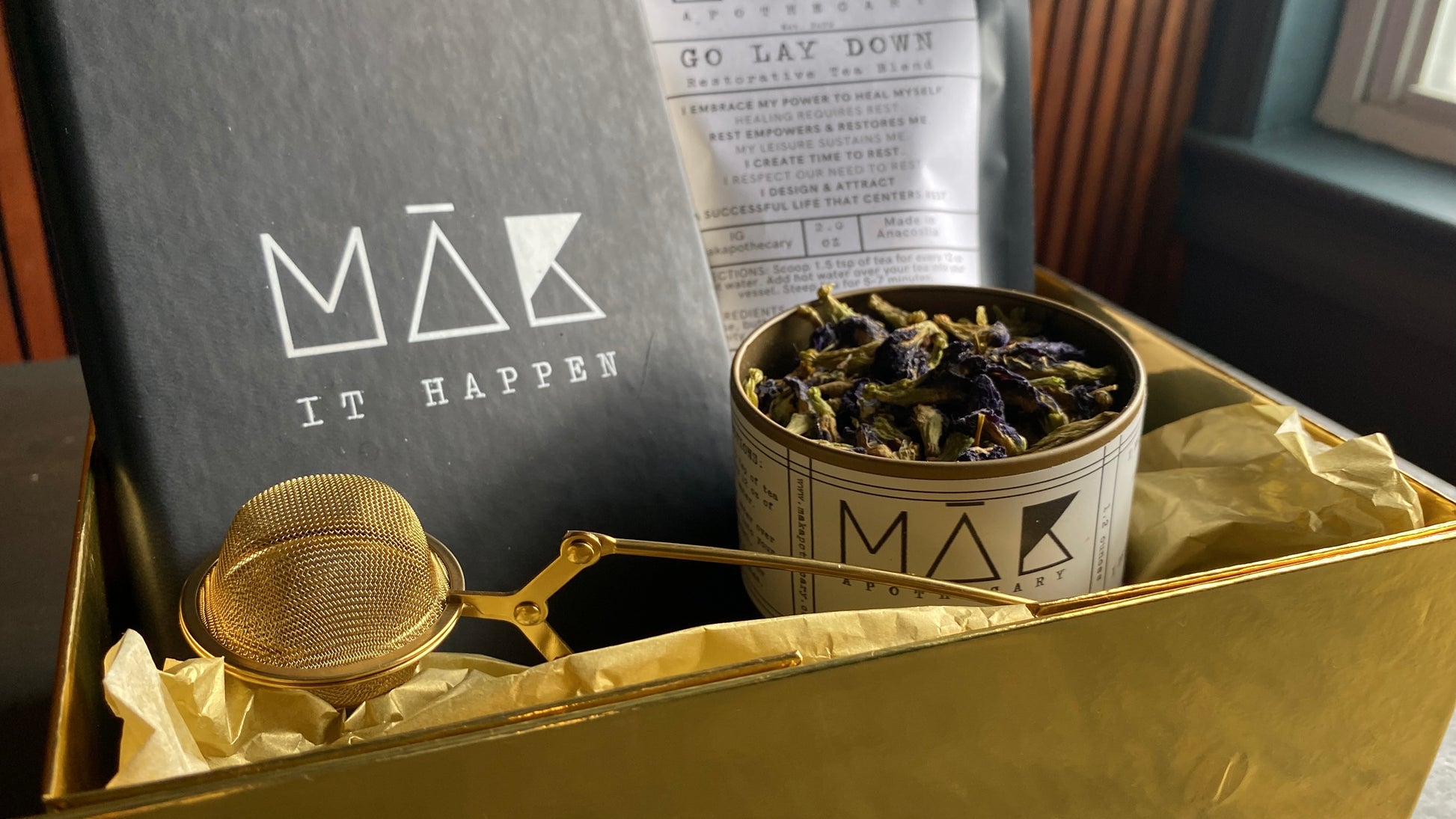 If you love the tea at the CommuniTEA Salon, this is box for you. Enjoy our signature blue tea - perfect for telling your nerves and anxiety to GO LAY DOWN! This box is the perfect gift for the tea lover you know or the tea lover in you. Care box come with a MĀK IT HAPPEN journal, a beautiful gold strainer, a matching gold tin of Go Lay Down tea, a refill bag of Go Lay Down tea as well as a sample of an unreleased tea blend to preview and enjoy.