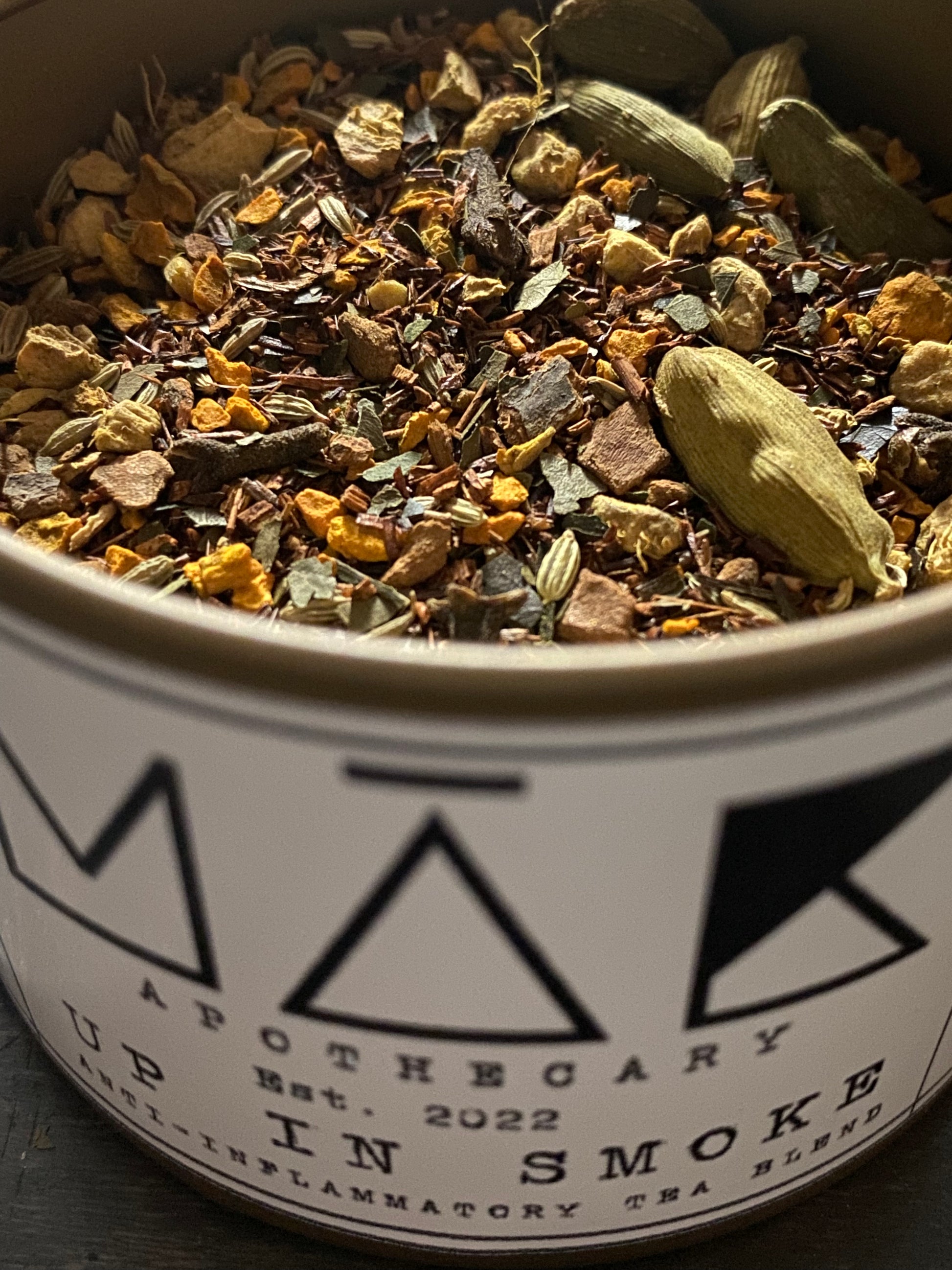 A rich blend of internationally adored herbs and spices, this tea works to turn fiery joint pain and inflammation in the body into smoke. Fragrant and warming, Up In Smoke support circulation, digestion and emotional restoration.